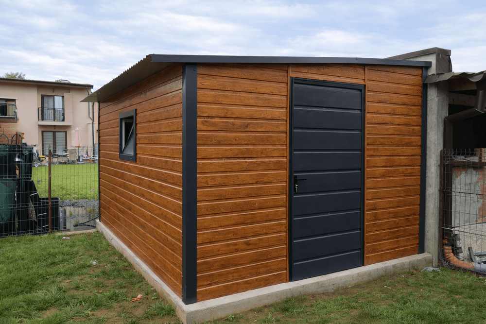 Căsuță de grădină 2,5 × 3 m în versiunea PREMIUM cu acoperiș în pantă spre stânga, în culoarea Nuc închis. Model modern și funcțional realizat din panou trapezoidal T7 orizontal cu imitație de lemn pe pereți. Ușa de intrare este în culoarea BTX7017 (antracit), iar profilele de mascare ale colțurilor pereților și colțurile acoperișului sunt în culoarea BTX7016 (antracit mat), ceea ce evidențiază aspectul modern al construcției. Căsuța este echipată cu fereastră în culoare antracit, care permite pătrunderea luminii naturale în interior și crește confortul utilizării.